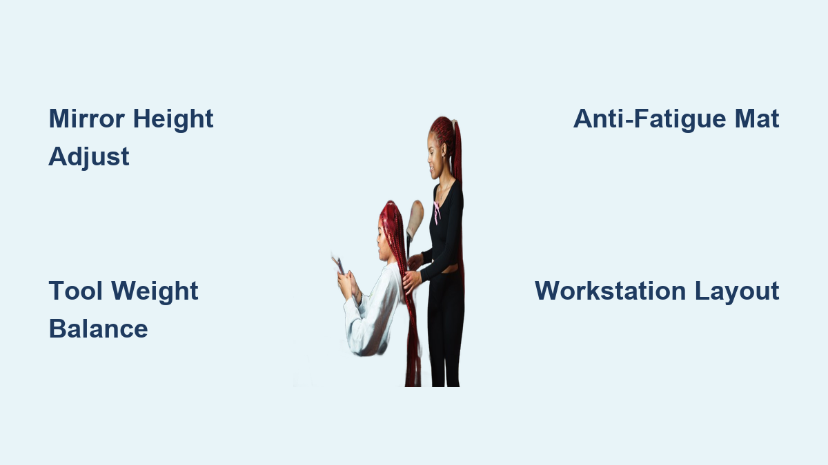 Since standardized guidelines don’t exist, develop your own assessment protocol using principles from occupational health frameworks. Start by documenting pain patterns in a journal, noting when discomfort occurs during specific services. For mirror positioning, stand in your natural working stance and adjust the mirror until you can see the crown of your client’s head without tilting your neck—this should position the mirror at eye level when standing straight. Measure your “tool triangle” by identifying three critical points: your dominant hand’s resting position, your scissor storage, and your comb placement. These should form a triangle no larger than 12 inches per side to minimize reaching. Implement anti-fatigue mats rated for salon environments (typically 3/4 inch thick with beveled edges), as even this basic measure reduces lower body strain by 30% according to general standing work research.